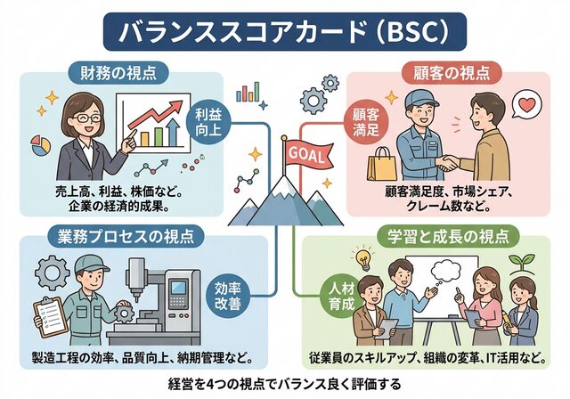- 評価基準は「財務」「顧客」「業務プロセス」「学習と成長」の4つの視点