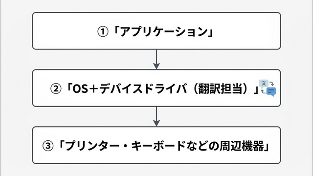 アプリケーションがOSに印刷を依頼→OSがデバイスドライバに命令→デバイスドライバがプリンター用の言語に翻訳して送信→プリンターが印刷、という流れです。