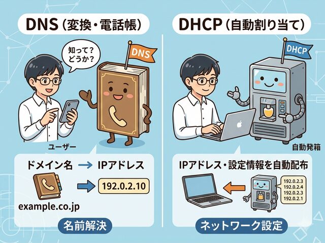 どちらもIPアドレスに関係するため引っ掛け問題としてよく出ます。「変換=DNS」「割り当て=DHCP」と覚えましょう。