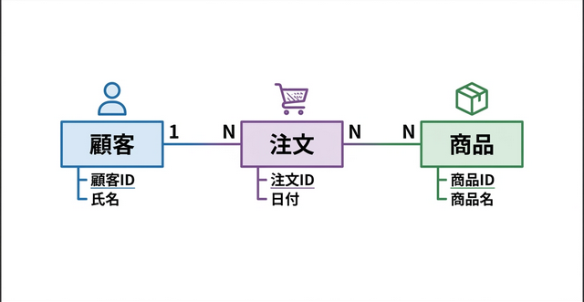 • カーディナリティ(多重度):エンティティ間の数的関係(1対1・1対多・多対多)。