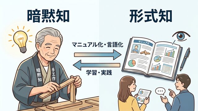 - 言葉にしにくい暗黙知と、マニュアル化された形式知がある。