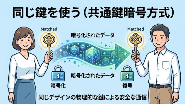 データを送る側が鍵を使って情報を暗号化し、受け取る側も同じ鍵を使って中身を確認します。このとき、二人が同じ鍵を持っていることが前提となります。