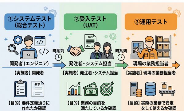 - 運用テスト:現場・運用者が「安定して使い続けられるか(バックアップ手順なども含む)」を確認する本番前のリハーサル。