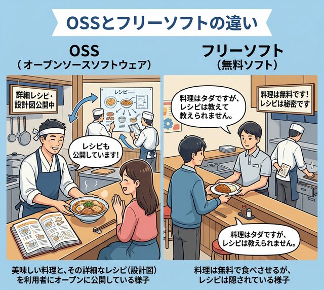 この記事では、IT用語が苦手な初学者の方でも直感的に理解できるように、OSSとフリーソフトの違いを「料理のレシピ」に例えてシンプルに解説します。
