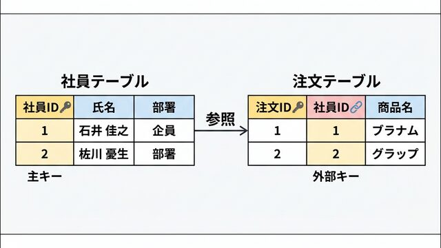 外部キーを設定することで「存在しない社員IDで注文データを登録できない」という制約が生まれます。これを参照整合性といい、データの矛盾を防ぐ重要な仕組みです。