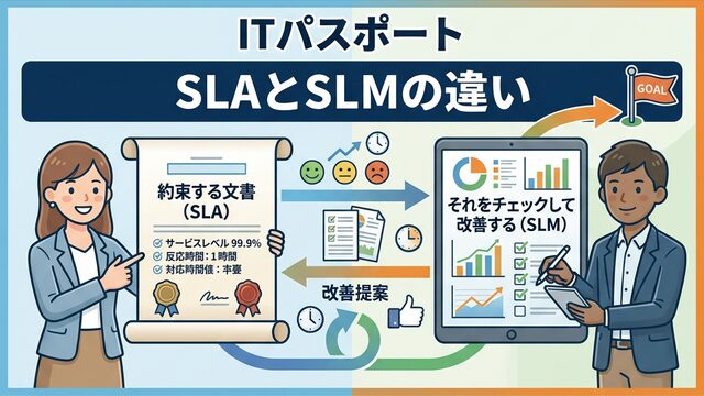 ITパスポートの試験で、SLAと一緒に頻繁に出題されるのがSLMです。この2つは名前が似ているので、それぞれの役割をしっかり区別しておくことが点数アップの近道です。
