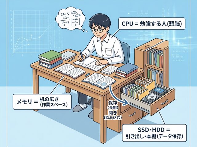 • パソコンの仕組み:CPU=頭脳、メモリ=机の上、SSD/HDD=引き出し。