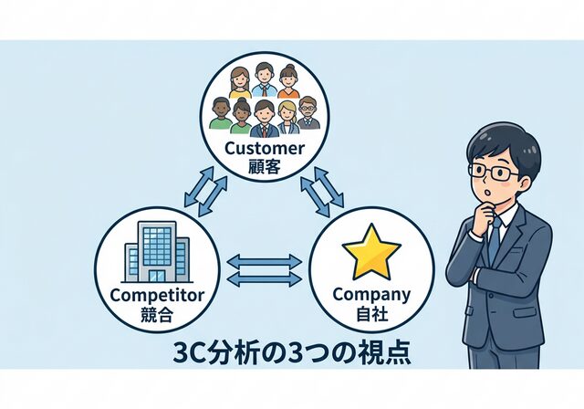 Customer(顧客)、Competitor(競合)、Company(自社)の3つのCで分析するのが3C分析です。