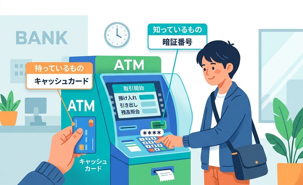 文字通り、本人が物理的に持っているアイテムを使って本人確認をする方法です。例えば、スマートフォンに届くSMSのワンタイムパスワード、銀行のキャッシュカード、会社のICカードなどが該当します。これらは形がある物なので、その人本人でなければ持っていないという前提で信頼性が保たれます。家の鍵そのものを持っている状態だと考えるとイメージしやすいでしょう。